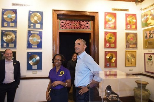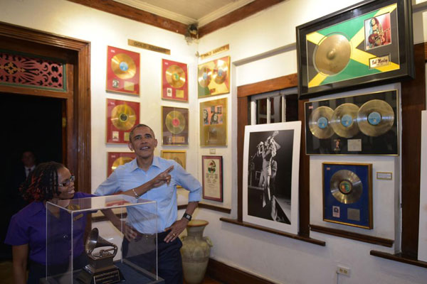 U.S. President Barack Obama, right, visits the Bob Marley Museum with tour guide Natasha Clark, left, Wednesday, April 8, 2015 in Kingston, Jamaica. (AP Photo/Pablo Martinez Monsivais)