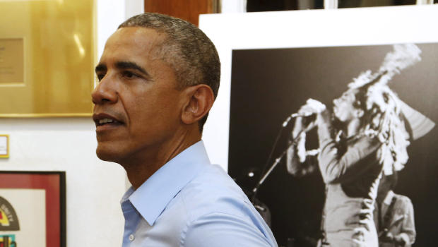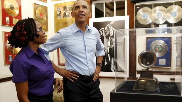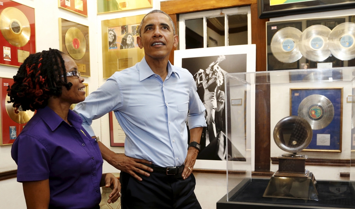 U.S. President Barack Obama looks on as he gets a tour of the Bob Marley Museum in Kingston, Jamaica April 8, 2015. While in Jamaica Obama will meet with leaders of CARICOM, the Caribbean Community nations, before continuing on to Panama for the Summit of the Americas. REUTERS/Jonathan Ernst