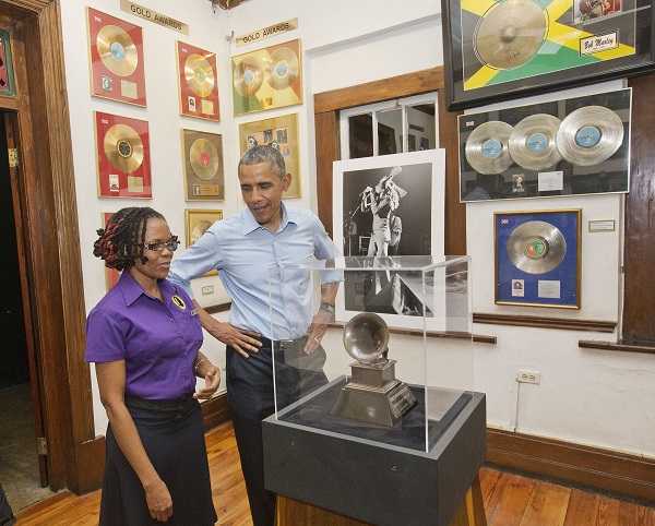 U.S. President Barack Obama visits the Bob Marley Museum with tour guide Natasha Clark. Wednesday, April 8, 2015 in Kingston, Jamaica. (AP Photo/Pablo Martinez Monsivais)